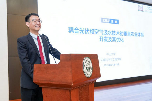 颁奖环节,杨挺先生向王鹏教授颁发ACT-UR奖杯及证书,并合影留念。王鹏教授现场分享了团队未来重要研究方向——耦合光伏技术与空气汲水技术的垂直农业体系开发及优化,该技术有望通过高效利用太阳能与空气汲水,为干旱地区构建新型垂直农业供水体系提供创新方案。此外,王鹏教授还介绍了中山大学碳中和与绿色发展研究院的发展成果与未来布局,该研究院将为中山大学助力国家“双碳”目标实现提供重要支撑。