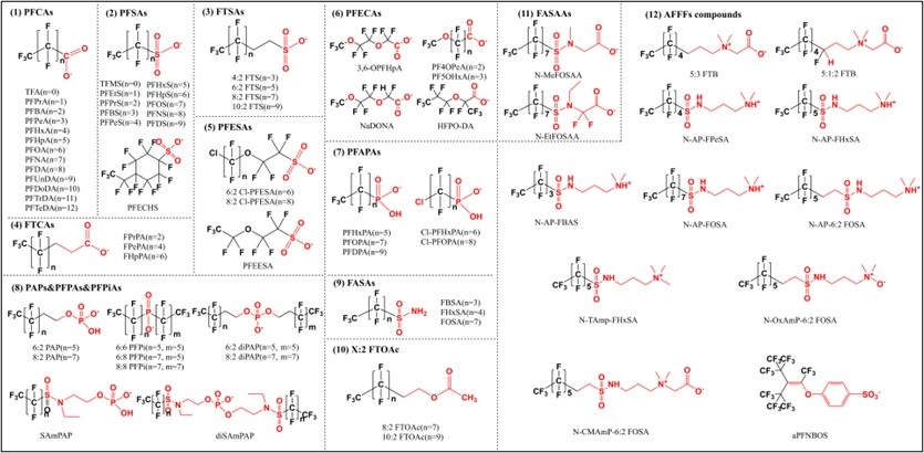 该分析技术可实现对71种PFAS的精准分析(图3),涵盖传统全氟烷基酸(PFAAs,如PFOA、PFOS等)、新型 PFAS(包括全氟醚类如GenX、F-53B、氯代多氟烷基类,超短链PFAAs等传统PFAS替代物)、PFAA前体物质(如氟调聚物、全氟磺酰胺类等可在环境中转化为PFAAs的潜在污染物)等。