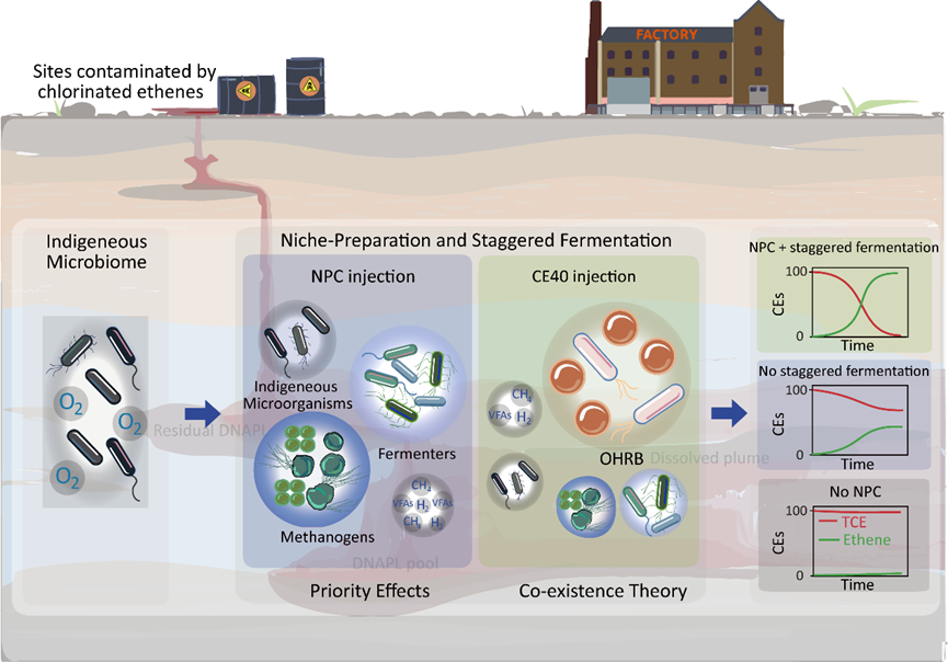 卤代烯烃(如四氯乙烯/PCE和三氯乙烯/TCE)被大量生产并广泛应用于工农业,造成严重的环境污染。相对目前流行的热脱附修复方法,生物修复具有经济、环保等优势,从而成为最具应用潜力的修复技术之一。卤代烯烃污染环境的生物修复主要通过脱卤呼吸菌/OHRB的还原脱氯呼吸过程实现完全脱卤,达到无害化处理的目的。但由于OHRB对生长环境要求苛刻、生长缓慢、易受种群互作关系影响等特征,基于OHRB的原位生物修复面临巨大挑战。目前已有的原位生物修复技术主要包括生物刺激和/或生物强化,通过向污染场地添加营养物质和/或功能微生物促进污染物的去除。生物刺激过程中,向污染场地添加的生物刺激材料不仅促进了脱卤菌,也无差别促进了脱卤菌竞争种群的生长,从而反向抑制了脱卤菌活性,最终导致修复周期长、脱卤不完全并产生有毒中间产物累积等常见问题。因此,本研究基于生态学理论的优先效应通过生态位预备作用为脱卤菌构建了适宜的生态位条件,再基于群落共存理论通过错峰发酵和增大脱卤菌接种比例调控脱卤菌与其它种群互作关系,促进了脱卤菌的竞争优势,使脱卤菌在污染场地能够稳定定殖并发挥长效脱氯活性,从而实现高效原位修复。文章链接://doi.org/10.1021/acs.est.3c05932